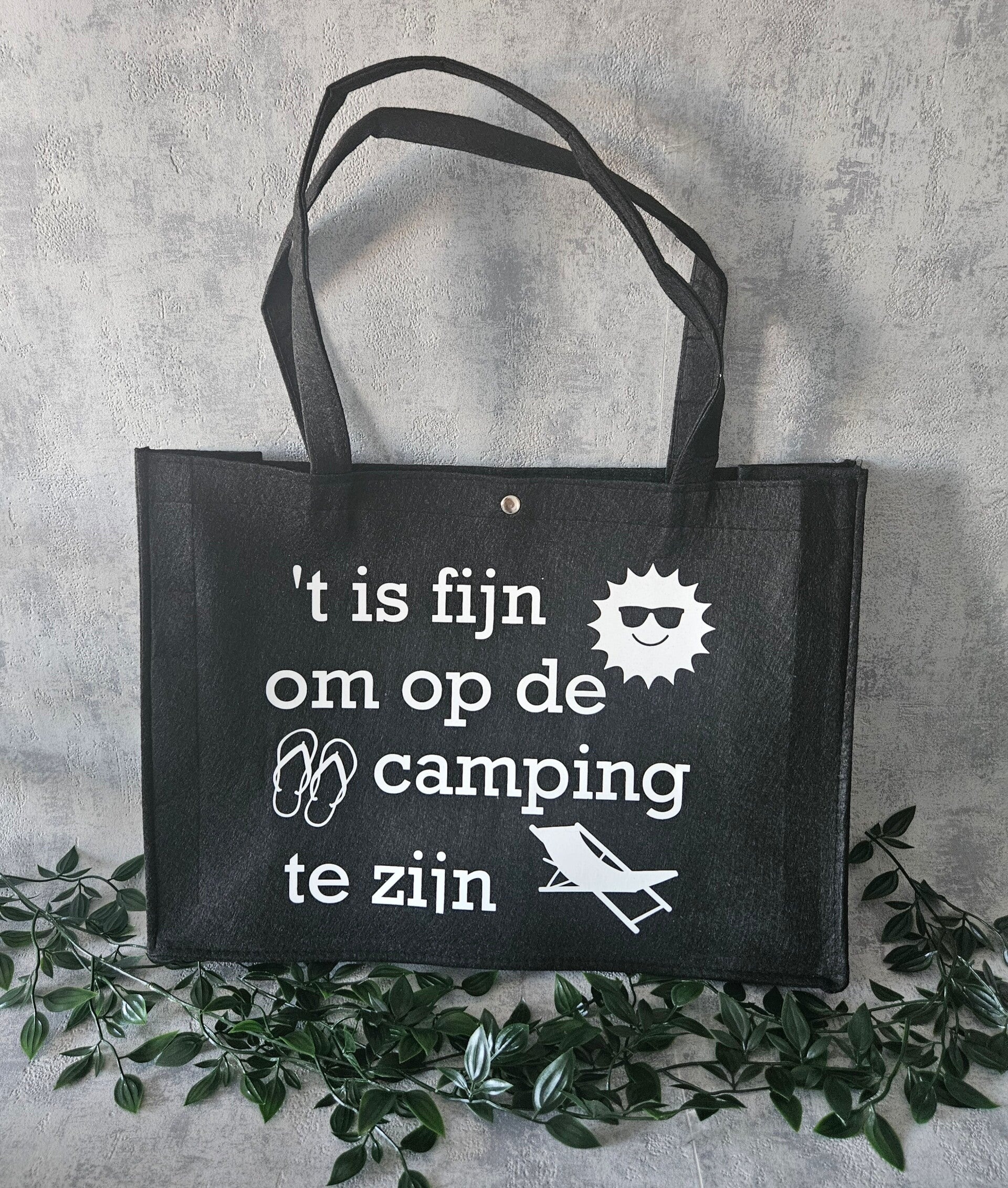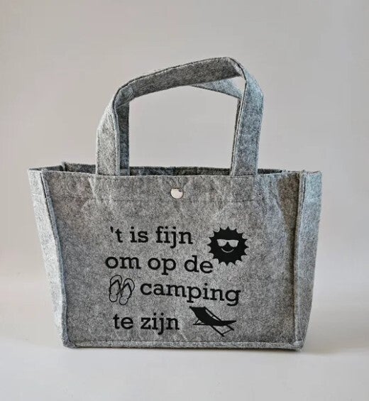 Niets zo fijn als wakker worden met fluitende vogels, de geur van verse koffie en je voeten in het gras. Deze vrolijke vilten tas met de tekst “'t is fijn om op de camping te zijn” brengt je meteen in vakantiestemming. Ideaal voor een boodschapje bij de campingwinkel, een dagje eropuit of gewoon om je kampeerliefde te laten zien.