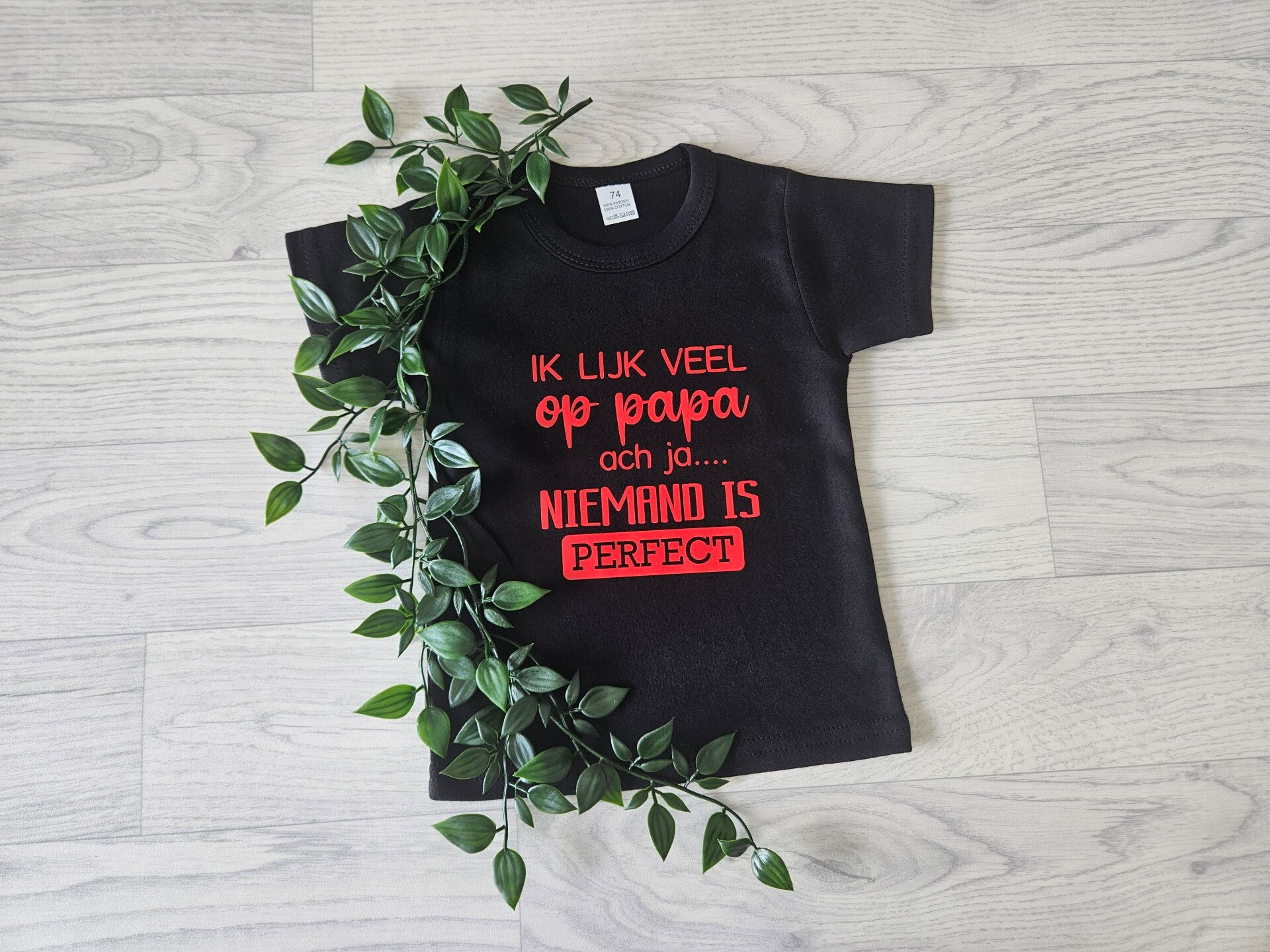 steelt jouw kind gegarandeerd de show. Een t-shirt vol zelfspot en liefde voor papa – en natuurlijk met een knipoog naar die ‘kleine’ imperfecties 😜
